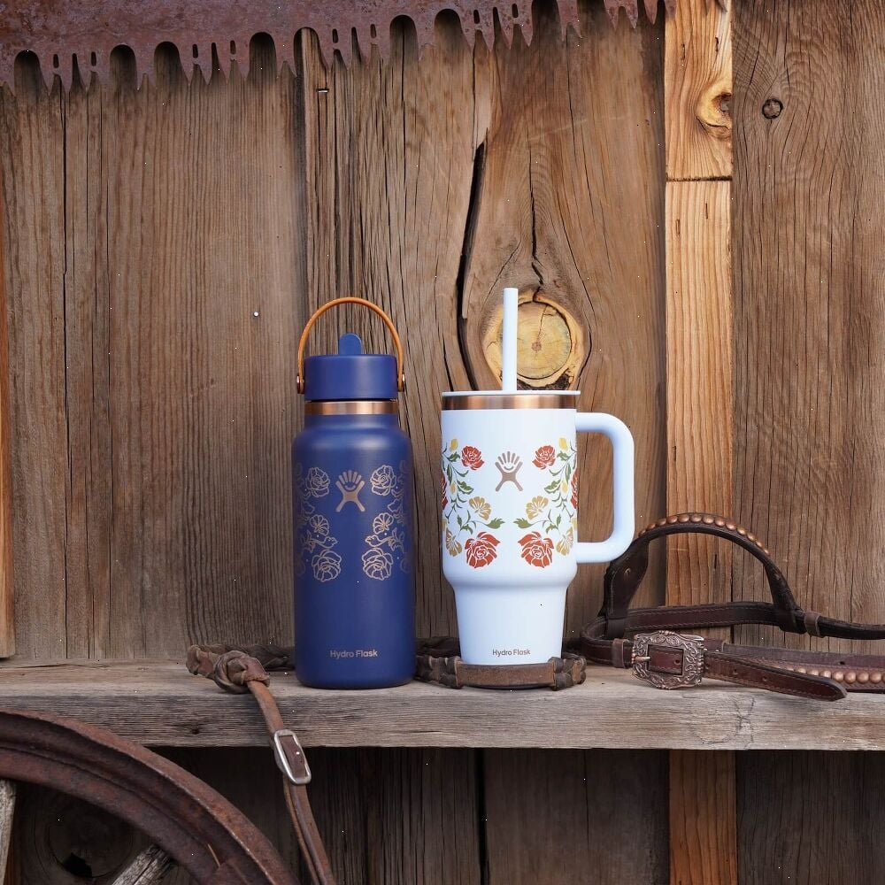 Stay hydrated with a nod to leather tooling and botanicals found Out West. Each Out West colorway features rose gold accents and floral designs designs with a hint of saddle adornment. Durable and dishwasher safe, this collection is right at home on the range. The insulated Hydro Flask 32 oz Travel Tumbler cup is here to hydrate more and refill less. The insulation keeps drinks cold for hours, and the durable handle makes it easy to take along anywhere. The 32 oz size stainless steel tumbler bottle can go anywhere, even fitting most cupholders. Cold stays cold, and the flexible straw is easy to sip any which way.