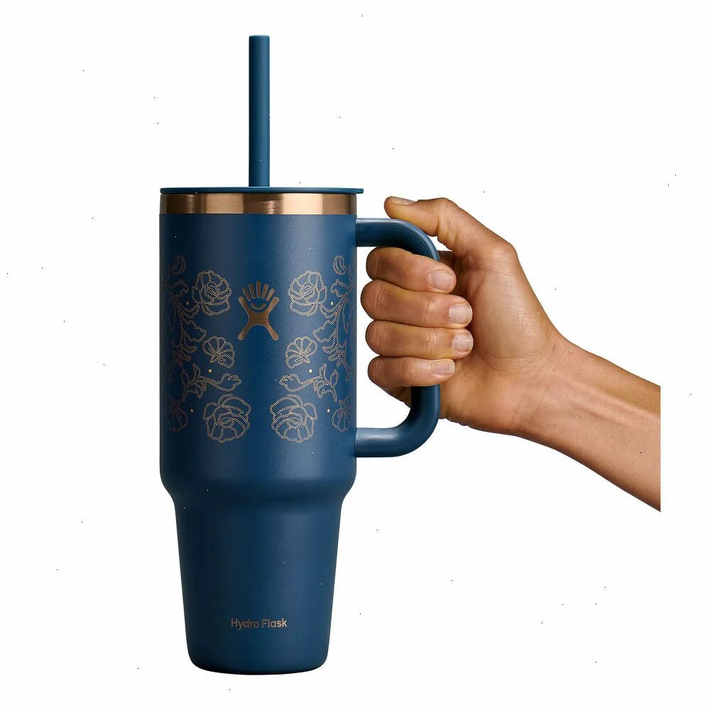 Stay hydrated with a nod to leather tooling and botanicals found Out West. Each Out West colorway features rose gold accents and floral designs designs with a hint of saddle adornment. Durable and dishwasher safe, this collection is right at home on the range. The insulated Hydro Flask 40 oz Travel Tumbler cup is here to hydrate more and refill less. The insulation keeps drinks cold for hours, and the durable handle makes it easy to take along anywhere. The 40 oz size stainless steel tumbler bottle can go anywhere, even fitting most cupholders. Cold stays cold, and the flexible straw is easy to sip any which way.